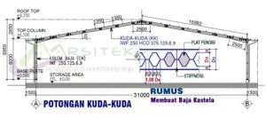 Contoh kasus, kuda-kuda bentang 45,0 meter. Jikalau menggunakan baja WF, minimal pakai WF 500×200. Yang mana berat material = 89,5 kg/m’. Sementara, jika kuda-kuda terbuat dari baja kastela. Minimal ukuran kastela 600×200. Dengan berat 66,0 kg/m.
